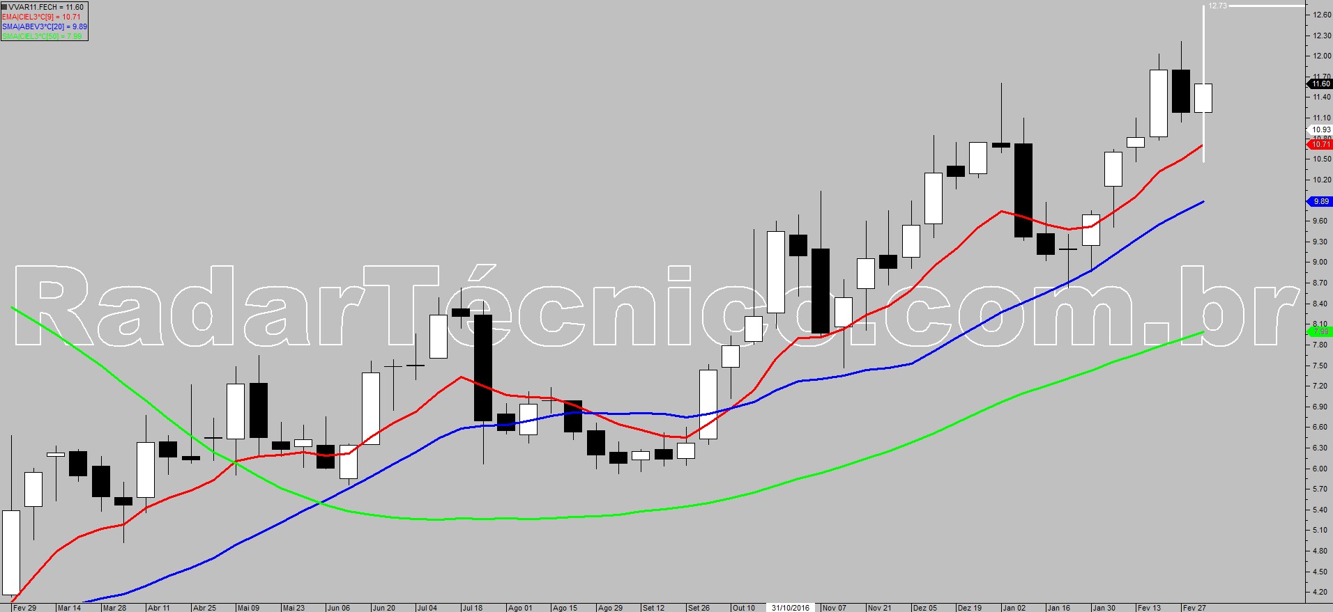 O papel VVAR11, com médias móveis de 9, 20 e 50 períodos, ordenadas e ascendentes possibilita um trade pelo setup de ponto contínuo, na superação de R$ 11,60 com alvo inicial em R$ 12,73 e stop posicionado em R$ 10,43.