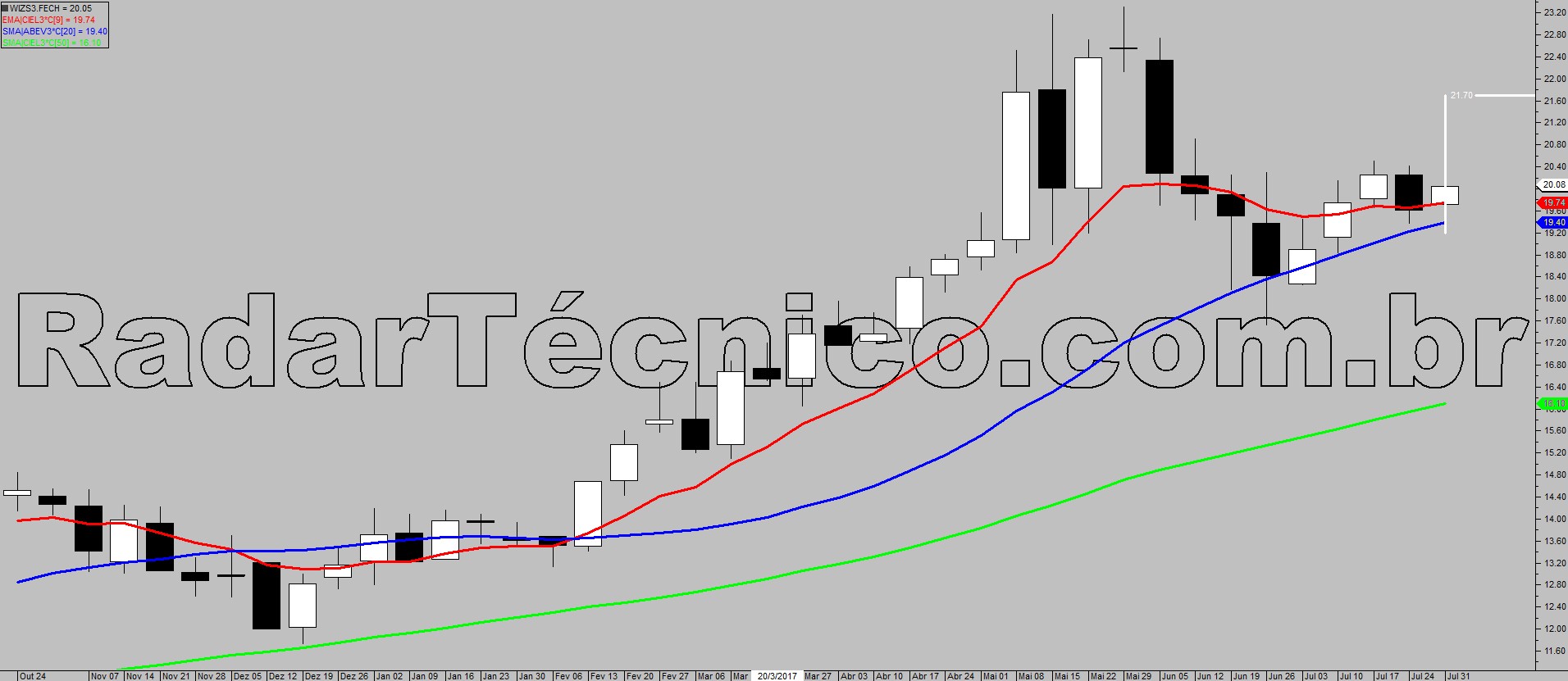 O papel WIZS3 encontra-se com médias móveis de 9, 20 e 50 períodos ordenadas e ascendentes, permitindo um possível trade pelo setup de ponto contínuo na superação de R$ 20,45 com alvo inicial em R$ 21,70 e stop posicionado em R$ 19,18.